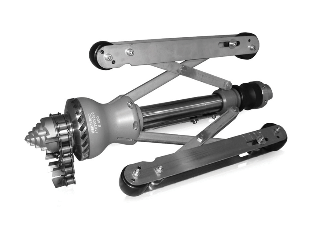 Отличается удобством в эксплуатации. Базовая насадка с прочнейшими раздвижными салазками и набором стальных цепей (без ножей) для труб диаметром от 200 мм; Возможно дооснащение до 400мм.